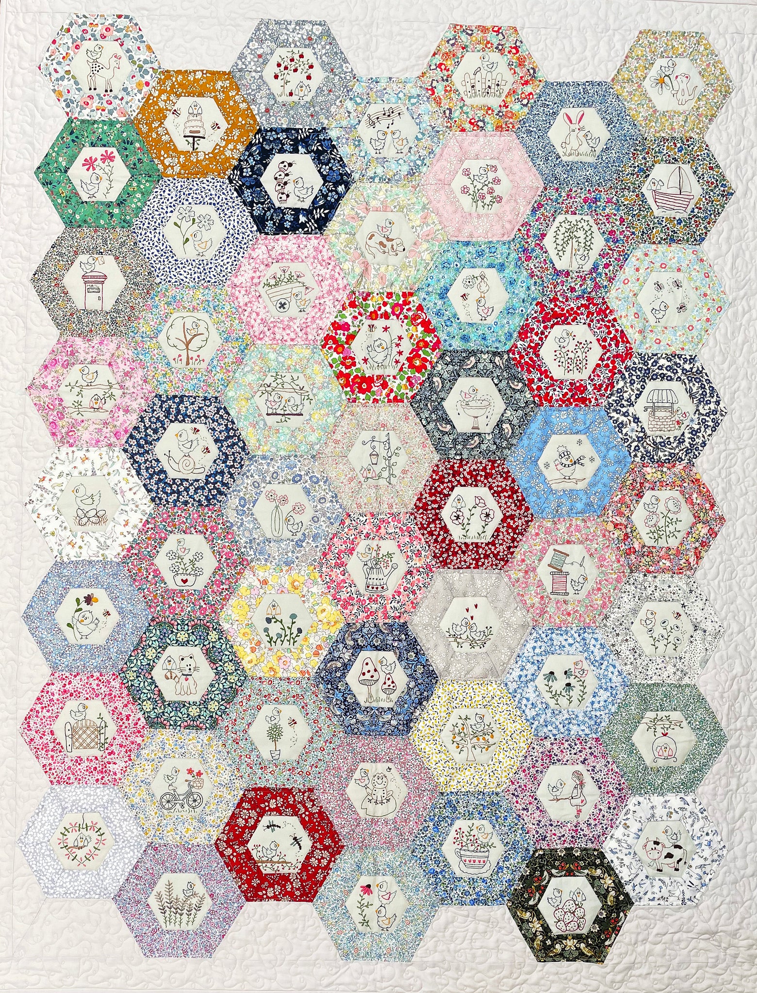 Sweet little bluebirds are stitched on linen hexagons in month one. A surprise each following month as you receive your block.